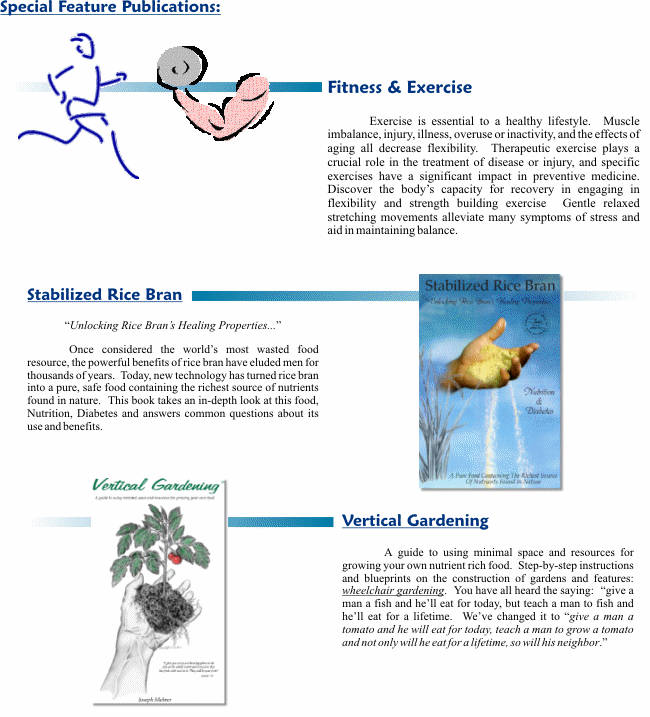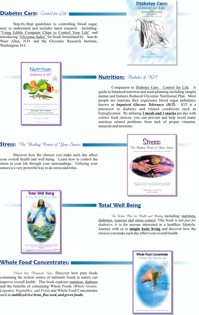 Description Price Diabetes Care: Control for Life $15.00 Nutrition: Diabetes & IGT $10.00 Stress: The Healing Power of Your Senses $10.00 Total Well Being $10.00 Whole Food Concentrates $10.00 Fitness & Exercise $10.00 Stabilized Rice Bran $5.00 Vertical Gardening $10.00 Food for the Body & Soul $20.00 Life is in the Journey $5.00 Digestion & Diabetes Facts $2.00 Request a FREE copy of "The Message" Coming Soon*: Grains...The Staff of Life Life Is In The Blood Vegetables...The Stem of Life Balancing Emotions Legumes...The Seeds of life Fruit...The Nectar of Life Sprouts...The Roots of Life Water...The Spring of Life Dehydrating...The Preservation of Life Man-Made...The Death of Life |